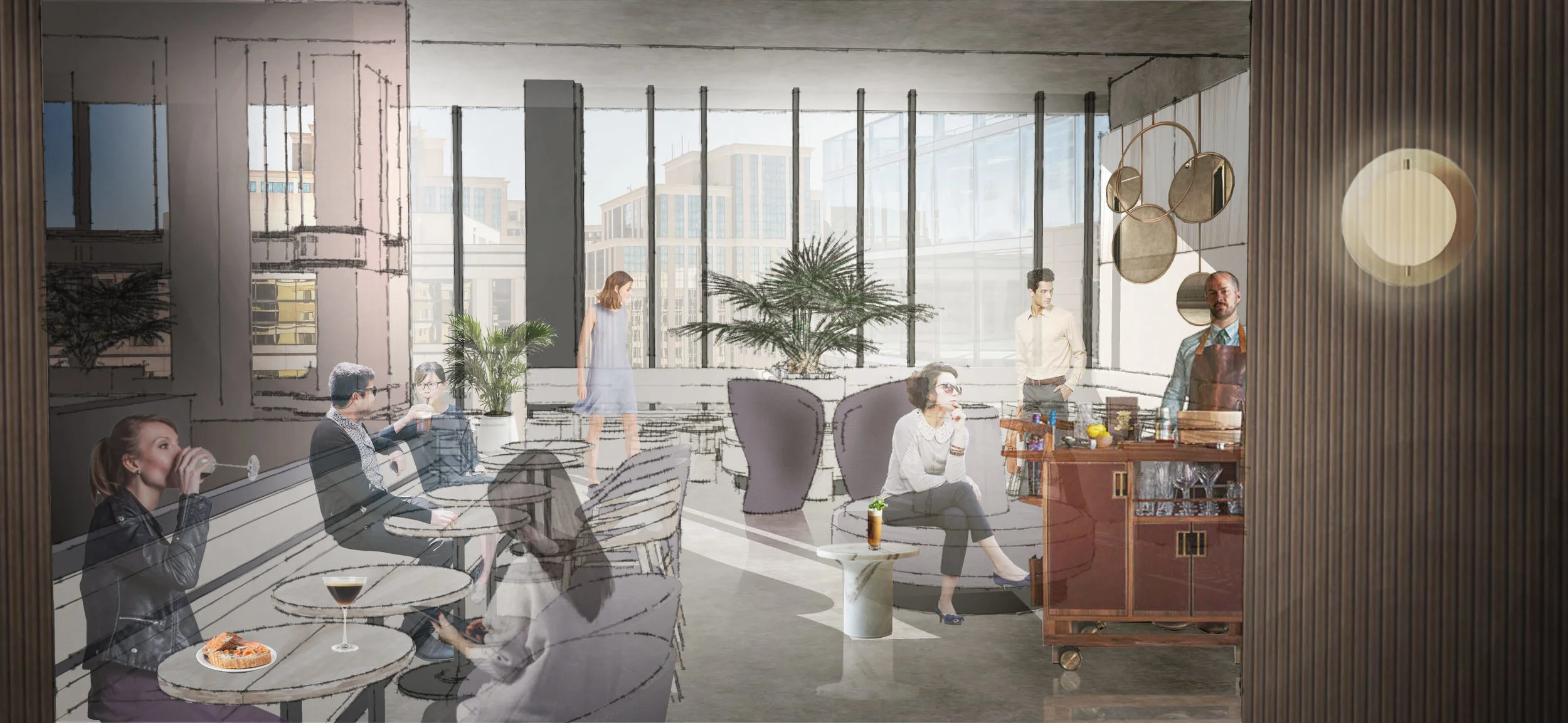 An experiential craft bar highlighting coffee craft and mixology where coffee infusion and production is highlighted and discussed in an open kitchen environment, encouraging customer engagement